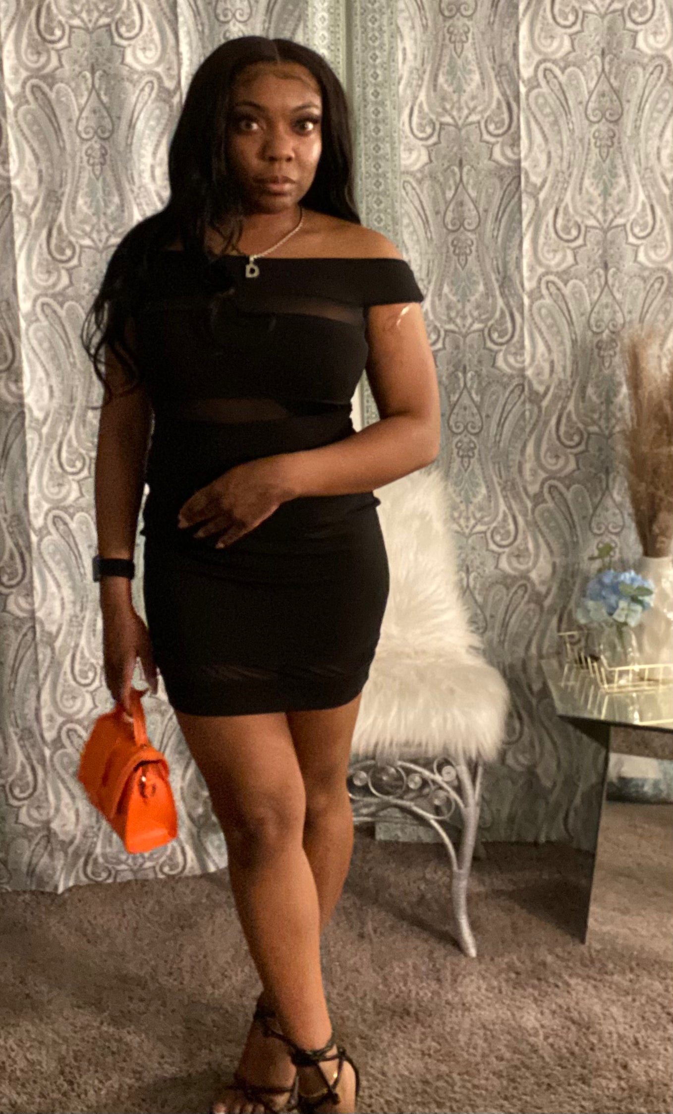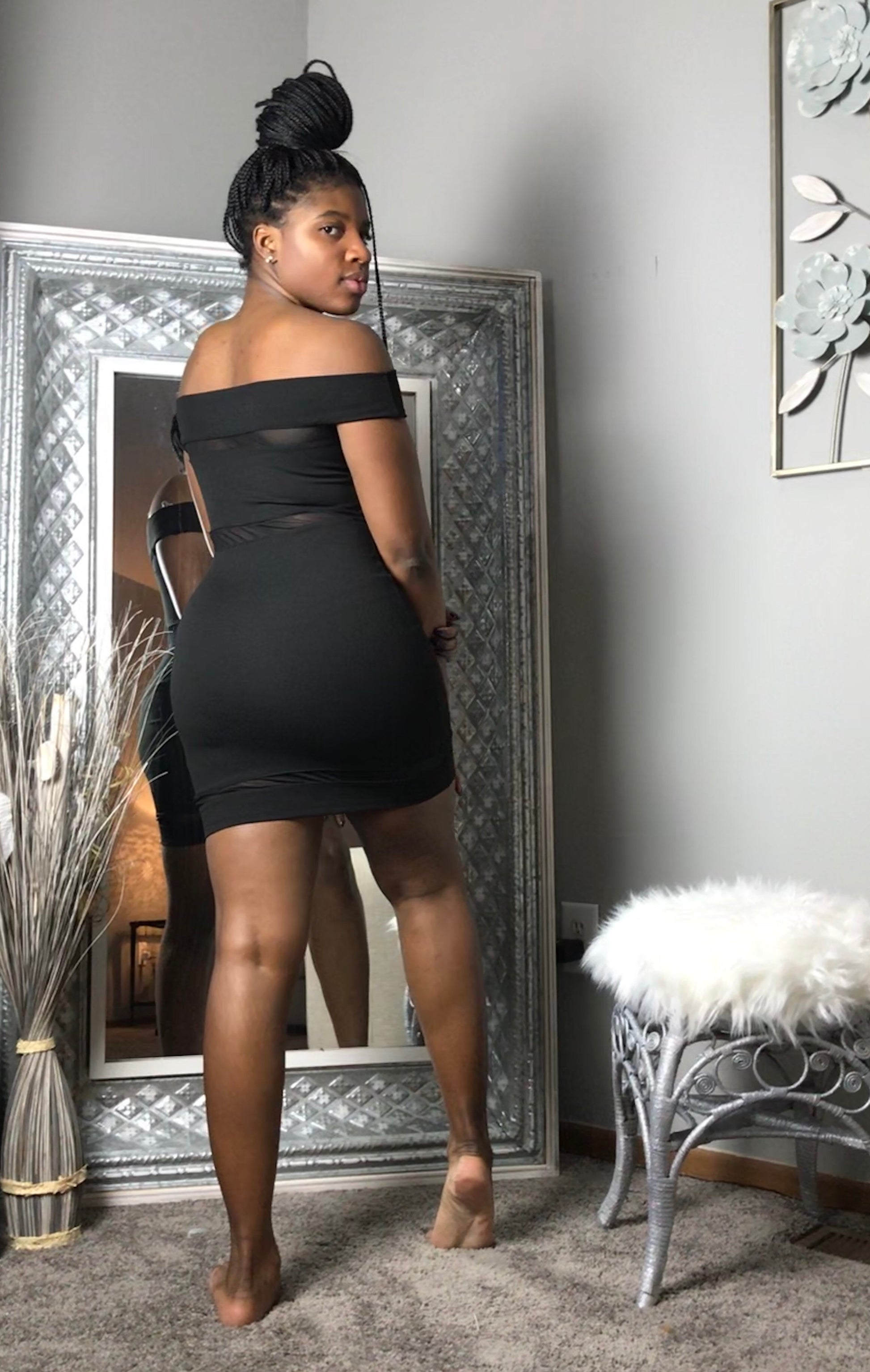 This dress features horizontal mesh above and below the bust and in mid thigh.